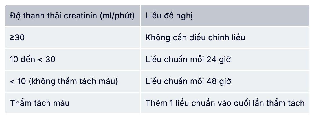 - Trường hợp suy thận: Cần điều chỉnh khoảng thời gian giữa các liệu cho bệnh nhân có độ thanh thải creatinin <30ml/phút theo bảng sau: