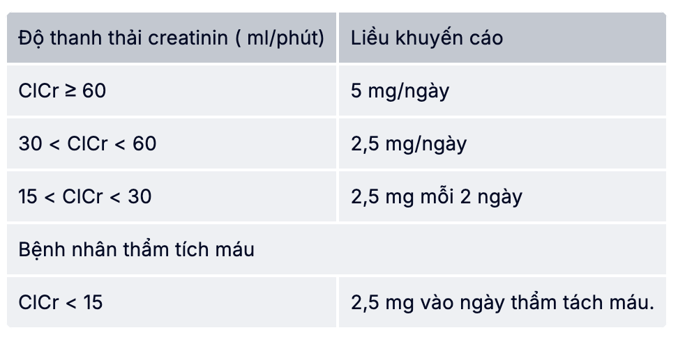 - Nếu bệnh nhân trên 65 tuổi, liều khởi đầu thường dùng là 2,5 mg/ngày. Sau 1 tuần điều trị, có thể tăng liều lên 5 mg/ngày và sau đó 1 tuần, tăng lên 10 mg/ngày.